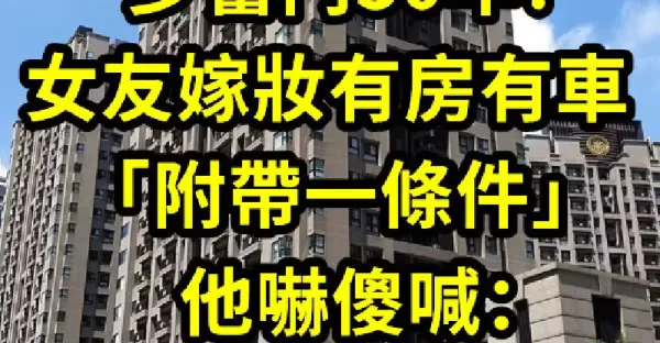 少奮鬥30年?女友嫁妝有房有車「附帶一條件」他嚇傻喊:想分手了