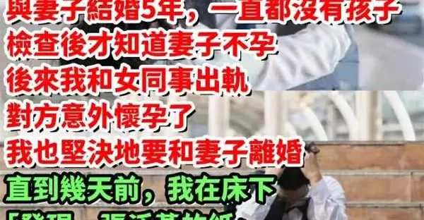 與妻子結婚5年,一直都沒有孩子,檢查後才知道妻子不孕。後來我和女同事出軌,對方意外懷孕了,我也堅決地要和妻子失婚。直到幾天前,我在床下「發現一張泛黃的紙!」,看完後當場淚崩:只有我被蒙在鼓裡…