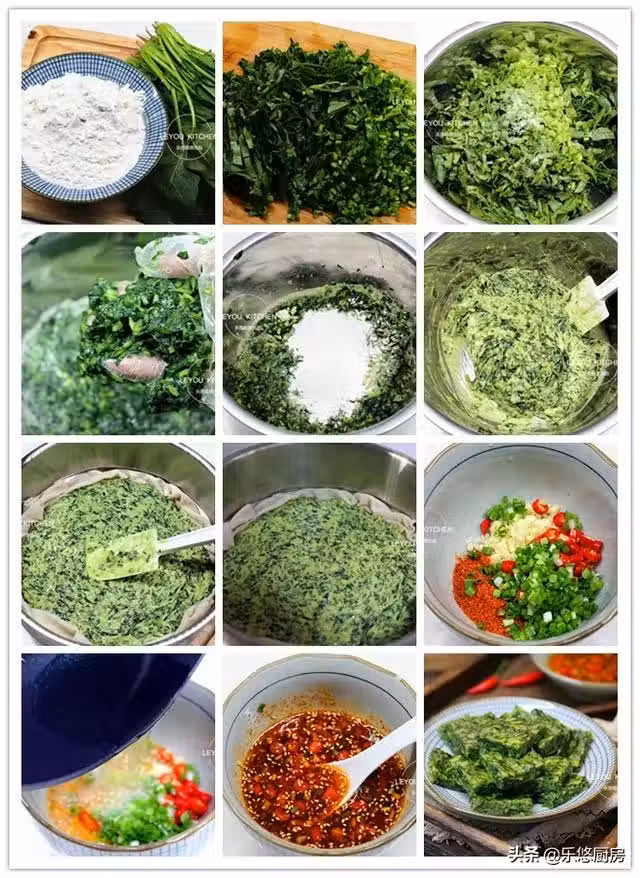 2、 在揉搓菠菜的時候,可以加一點鹼面或者小蘇打,蒸好的顏色更翠綠,口感也更好。鹼面和小蘇打的量不用太多,用手指粘一點點即可。