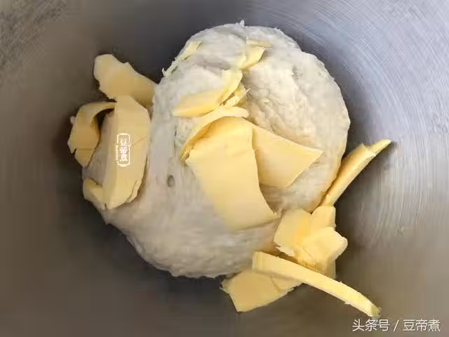 3、攪揉至擴展的時候加入室溫軟化的黃油,繼續攪揉至出膜進入二發階段