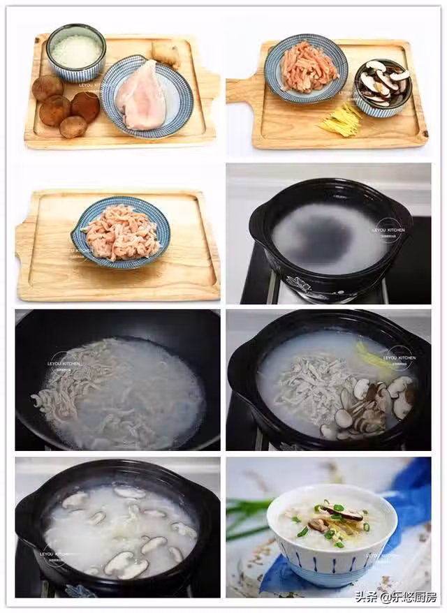 第六步:待粥快要煮熟的時候,把焯好的雞肉絲、香菇片、薑絲放入鍋中煮10分鐘左右。