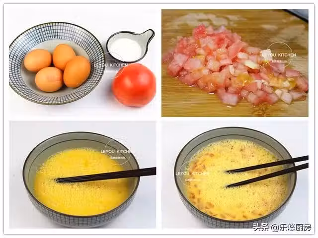 第四步:把西紅柿丁、牛奶、鹽放入蛋液中攪拌均勻。