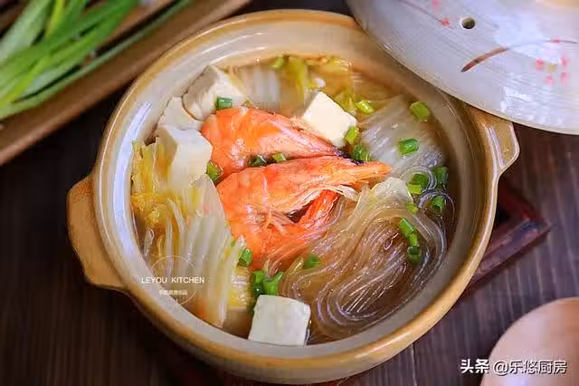 第一步:準備食材。白菜600克、豆腐1塊、紅薯粉條適量、鮮蝦幾個、蔥姜蒜適量、香蔥適量。