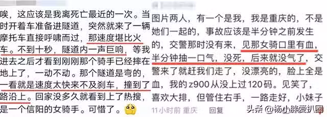 但卻有一輛摩托車突然加速衝進隧道呼嘯而過,下一秒隧道內就爆發一聲巨響,等他進入隧道後才發現剛才駕駛摩托的那位美女已摔倒在地,面部與嘴裡有血,沒過幾分鐘就沒氣了。