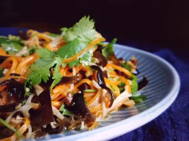 金針菇200g;胡蘿蔔一根;木耳適量;蒜7瓣左右;香菜適量;油適量;蒸魚豉油一勺;鹽適量