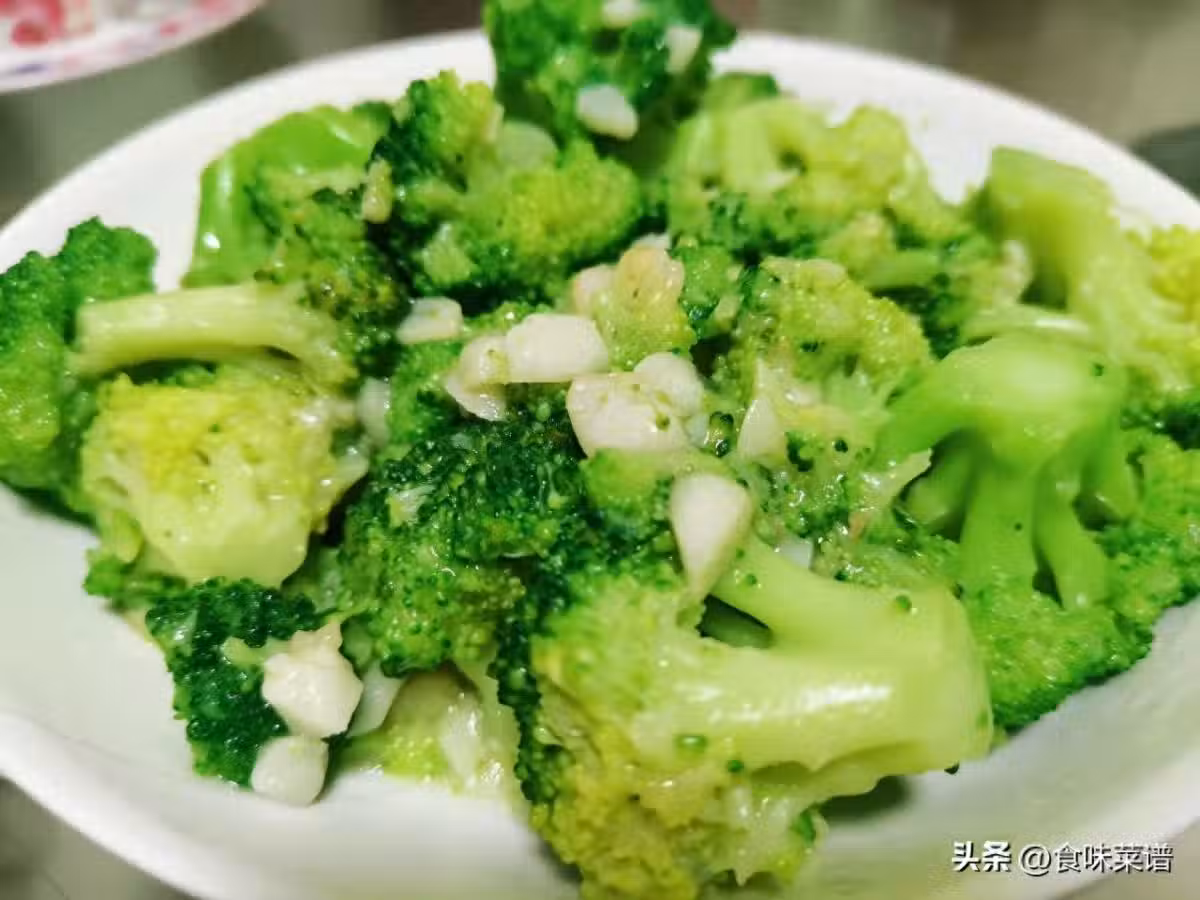 3、熱鍋涼油,放入蒜蓉煸炒出香味,然後放入焯燙好的西蘭花翻炒均勻。