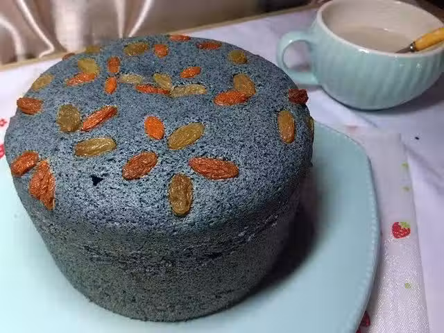 雞蛋4個;豆漿60克;植物油10克;白糖45克;黑米粉50克;低粉50克;泡打粉2.5克;白醋(檸檬汁)幾滴;枸杞、葡萄乾(裝飾用)適量