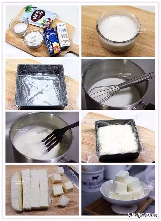 第六步:關火,把鍋里的奶糊倒入模具中攤平,室溫放涼後,放入冰箱冷藏3-5小時。