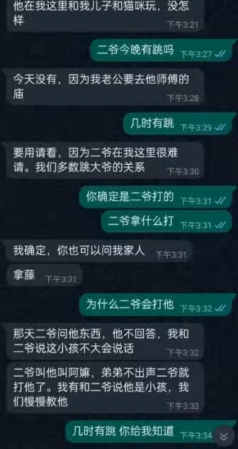 根據內容,男童母親再追問,是否「二爺伯」打人、拿什麼打,及為何會打人時,保母回應,當天「二爺伯(黑無常)」藉著上身的乩童,詢問男童時,對方卻沒回答,她隨後便稱男童「不大會說話」。