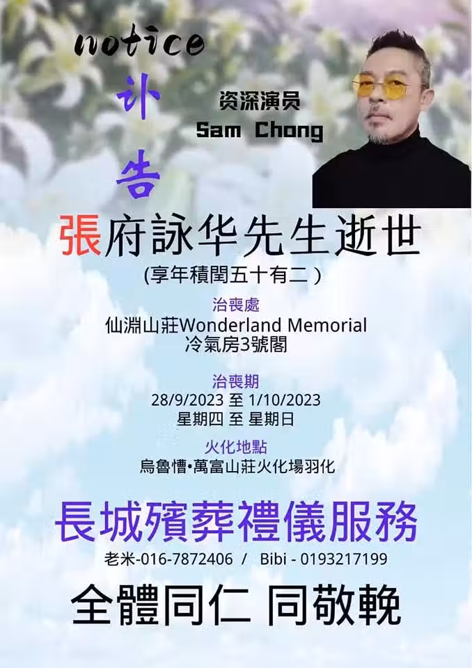 (吉隆坡28日訊)大馬「最強綠葉王」張詠華27日傳出在爬山時突然暈倒,被緊急送醫搶救,最終不幸離世,享年51歲,消息傳出後令影迷錯愕。好友林德榮今日代家屬發布訃告,其喪禮於今日(28 日)在柔佛仙淵山莊舉行。