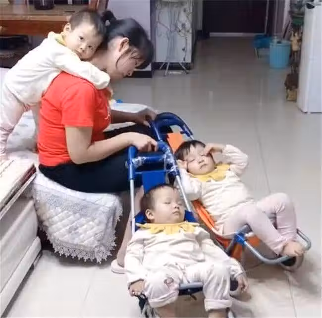 我們都知道生三胞胎的機率非常低,所以大家都會十分羨慕這樣的家庭。很多時候我們只看到他們光鮮的外表,卻體會不到他們的背後付出的心酸。三個孩子帶來的快樂是一個孩子的三倍,同樣,照顧他們也需要付出三倍的辛苦。我們經常聽到有人說一個孩子就能把全家大人累垮,更不要說一個人照顧多個孩子了。