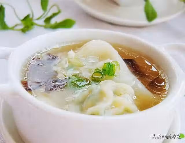 8、開水下入餛飩煮開後,小火煮2、2分鐘,接著取一乾淨碗,裡面放少許生抽、紫菜、蝦皮、鹽、高湯調勻,盛入餛飩即可。