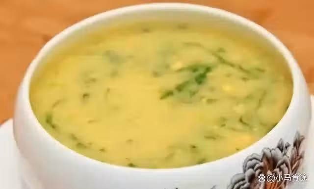 2.起鍋燒油,燒至五成熱,先放入豬油渣炒香,下入切碎的小青菜梗,中火炒半分鐘,再倒入高湯和捏碎的豆腐丁,大火燒開,用小火燒2分鐘,下入調好的玉米糊和少許鹽,小火慢慢熬至湯汁濃稠,最後淋入少許熟豬油,出鍋裝入容器內,撒上蔥花點綴一下。