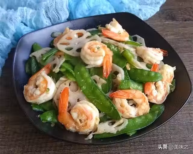 藕100g、荷蘭豆100g、對蝦10隻、鹽3g、薑末3g、白鬍椒粉1g、蒜2g。