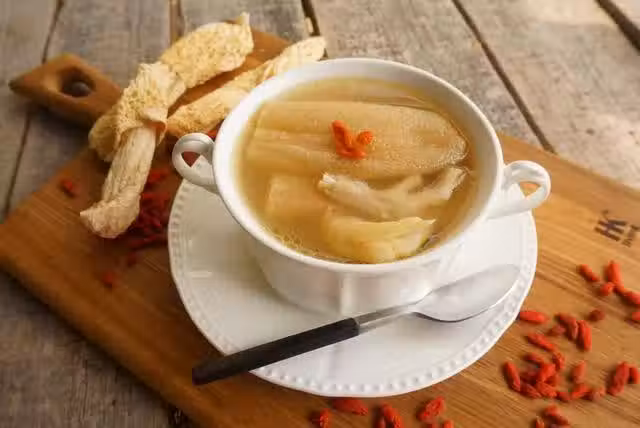 5、大約1小時後,雞湯呈現金黃色。這時將枸杞和切段的竹蓀,投入雞湯中煮大約10分鐘,等竹蓀吸收雞湯的味道。最後根據個人口味加鹽,關火。