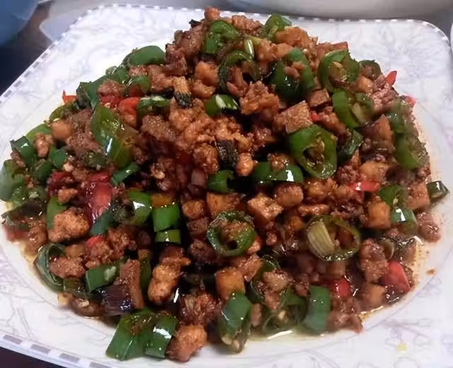 2.起鍋燒油,下入五花肉末炒出油,下入干豆腐丁、姜蔥蒜炒香,烹入料酒,調入鹽、醬油、干辣椒粉、孜然粉、十三香、味精、白糖少許翻炒入味,下入尖椒和小米辣炒出辣香味即可出鍋裝盤。