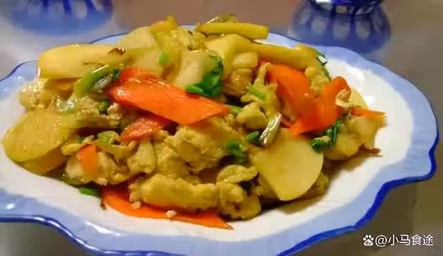 3.再起鍋燒油,先下入胡蘿蔔炒出香味,再下入蘋果炒香,調入鹽、生抽、味精,翻炒均勻,倒入雞蛋,翻炒入味,撒入蔥花,即可出鍋裝盤。