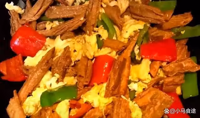 3.再起鍋燒油,下入青紅椒片,加點鹽,煸炒出香,下入辣條和雞蛋,快速炒勻,即可出鍋享用。