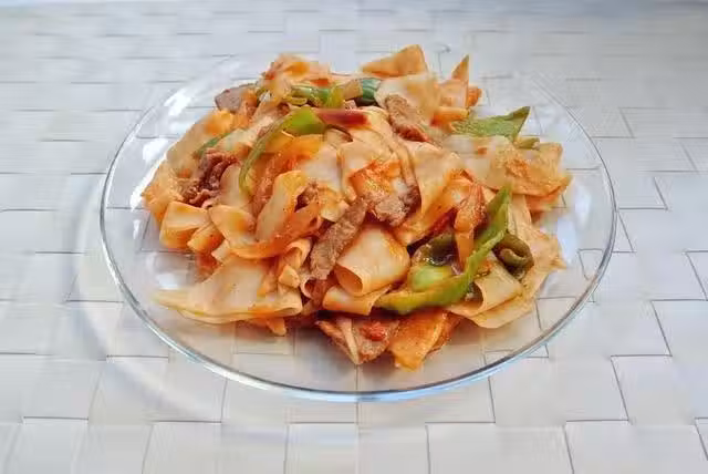 牛肉片;青椒;番茄;面片(超市有現成的賣);料酒;蔥;姜;鹽;洋蔥;花椒粉