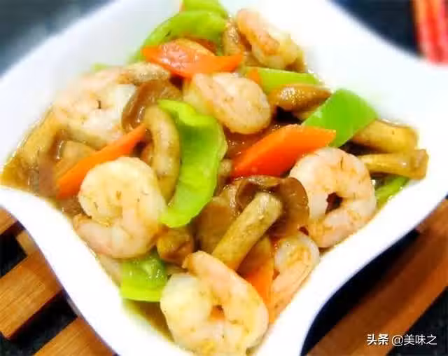 油蘑300克、蝦仁150克、青椒各適量、胡蘿蔔適量、澱粉適量、鮑魚汁2大勺、蔥適量、薑末適量、鹽1茶勺、生抽1茶勺、雞精適量、料酒1茶勺、糖少許。