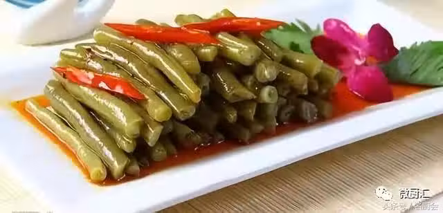 用涼開水將鹽化開,把去皮蒜瓣、干辣椒、生薑放在鹽水中泡1個月;將四季豆擇去老筋洗凈,晾乾表面的水分,把前制好的泡菜水倒入壇中,再放入豆角,用竹片將菜夾緊,壓上石塊。