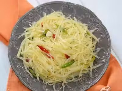 2、把土豆切成絲,蔥、姜、蒜切好。青椒也切成絲。