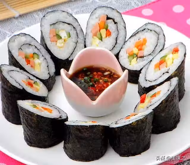 米飯一碗、壽司紫菜3張、雞蛋2個、黃瓜適量、胡蘿蔔適量、青甜椒適量、紅甜椒適量、火腿適量、壽司醋適量、白醋2湯勺、白糖1湯勺、水澱粉1湯勺、鹽1茶勺。