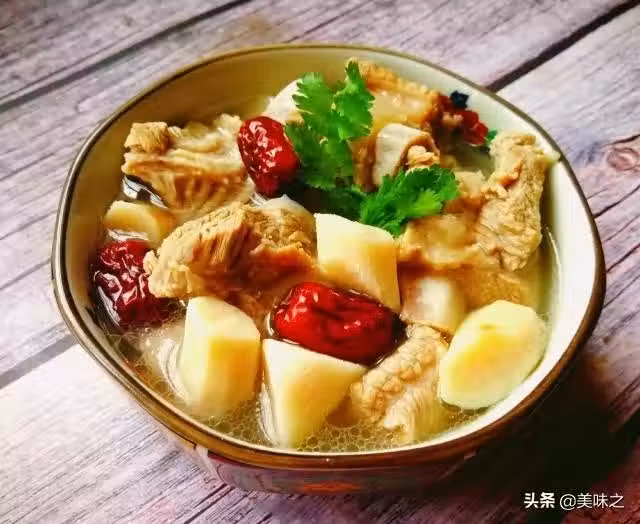 6、燉好的紅棗山藥排骨湯,盛碗,適量鹽,胡椒粉,喜歡香油陳醋的可倒入適量調味。
