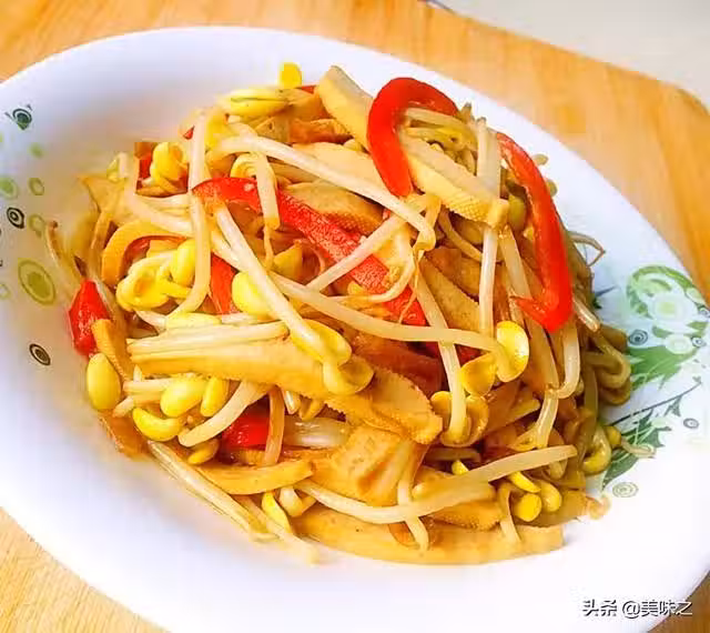 黃豆芽200g、五香豆乾2塊、大紅辣椒小半個、蒜3瓣、糖1小勺、鹽適量、生抽2勺。