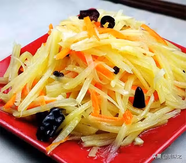 土豆200克、胡蘿蔔50克、鹽2克、雞精2克、糖5克、白醋10ml、花椒5粒、干辣椒2個、食用油適量。