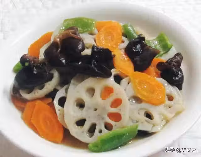 1、蓮藕洗凈去皮切片、青椒去蒂去籽清洗切開、胡蘿蔔清洗去皮切片、黑木耳泡發清洗。