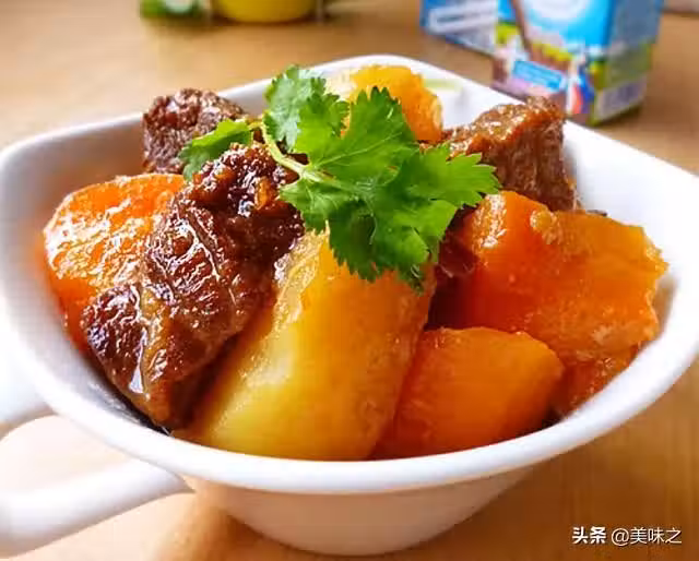 牛腩適量、胡蘿蔔適量、土豆適量、香菜適量、生抽適量、老抽適量、桂皮適量、花椒適量、八角適量、冰糖適量、干辣椒適量、姜適量、蒜適量、料酒適量。