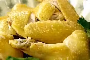 4、吃的時候將雞一分為四,分別切成手指般粗細的條,裝入用黃瓜條墊底的盤中,用微波爐高火加熱1分鐘即可裝盤上桌。