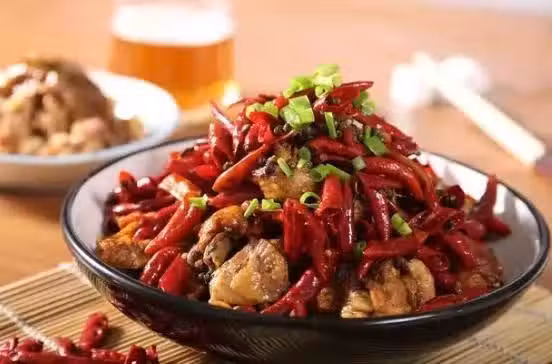 3.倒入油(用鏟子,一鏟子油就好),放入辣椒、花椒,大蒜、生薑,蔥段,小火翻炒至到入雞肉,翻炒幾分鐘,裝盤。