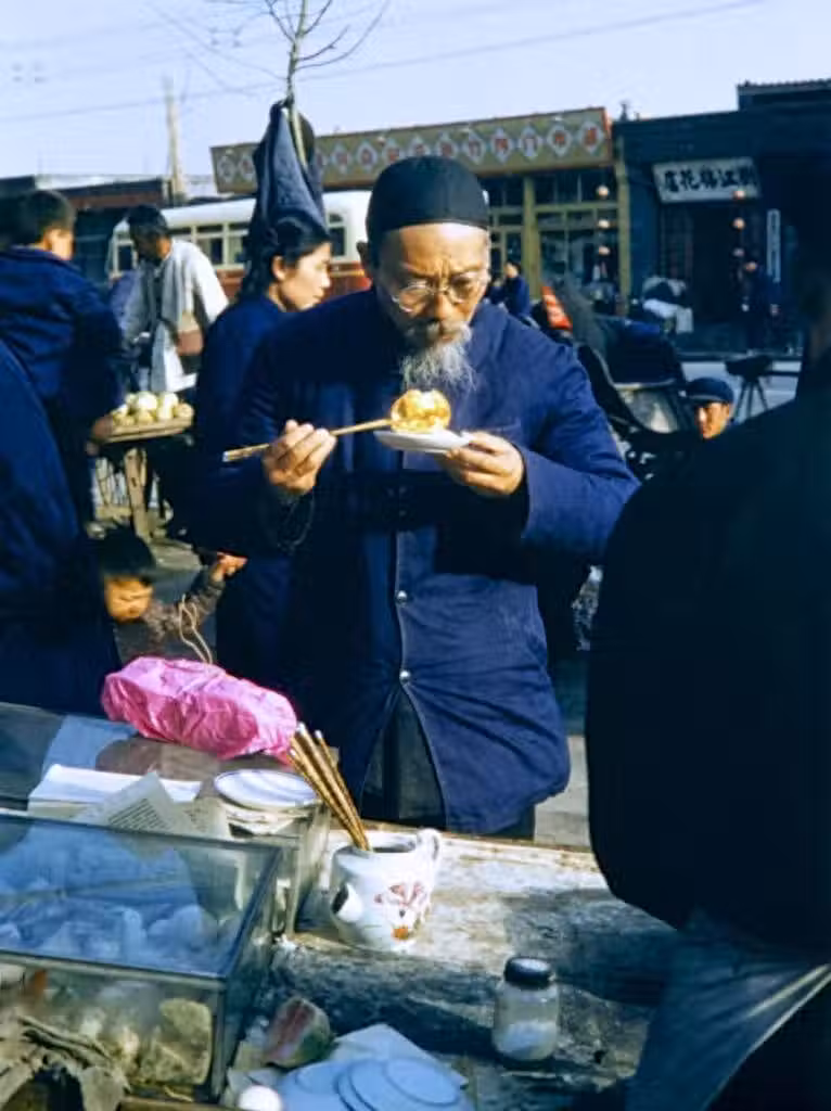 1959年的北京,外來人口比較少,大多是生活在皇城根的「老北京」。他們的飲食習慣,既有燕趙大地的古老傳統,也有滿蒙少數民族留傳下來的飲食痕跡。豆汁兒、焦圈、驢打滾比較有地方特色。這個北京大爺,可能是一個知識分子。