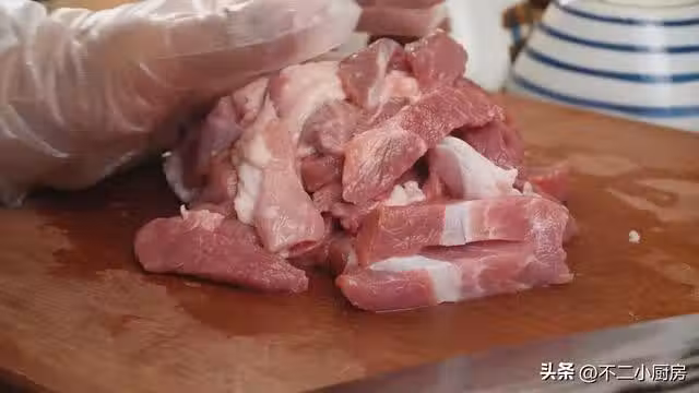 1、首先準備一塊這種梅花肉肥瘦相間,吃起來不會膩不會柴,把它首先切成厚厚的片,大約是一厘米厚,然後再切成條寬度同樣控制在一厘米左右,這樣比較容易入味。切好之後給它裝入到一個大碗中。