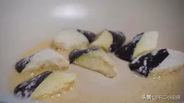 5、鍋中加入少量的油,把裹好澱粉的茄子一個下入鍋中,我們給它煎制一下,煎這個茄子不會吸太多的油,吃起來不會油膩,並且口感吃起來會更加的香,我們可以晃動一下鍋,避免粘連,全程要保持中小火煎制。