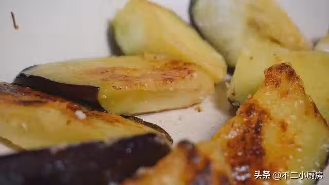 6、煎至茄子一面金黃以後,用筷子再給茄子翻一個面,煎至另一面,這裡的火一定不要太大,不然會把茄子表面給它煎糊,翻過面以後繼續保持中小火給它煎制,茄子滋滋的響,這個聲音真的好治癒,然後把茄子煎到這種兩面金黃,像這個樣子就可以了,我們可以給它盛出來,放入到碗中備用。