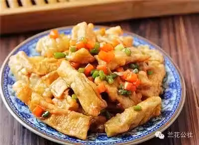 10)鍋里少許油燒熱,將切碎的胡蘿蔔、蒜薹丁下鍋翻炒。