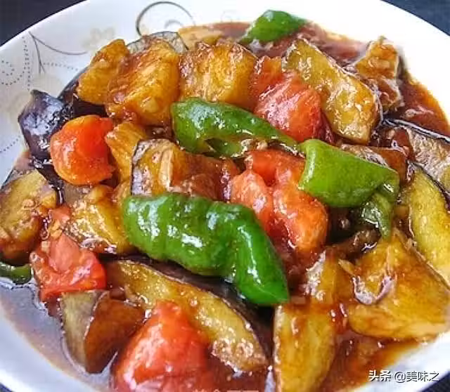 茄子1個、西紅柿1個、青椒1根、蔥1根、生薑1塊、大蒜1頭、玉米澱粉適量、料酒1湯匙、香醋1湯匙、老抽半湯匙、白糖1勺、食鹽適量、雞精少許。