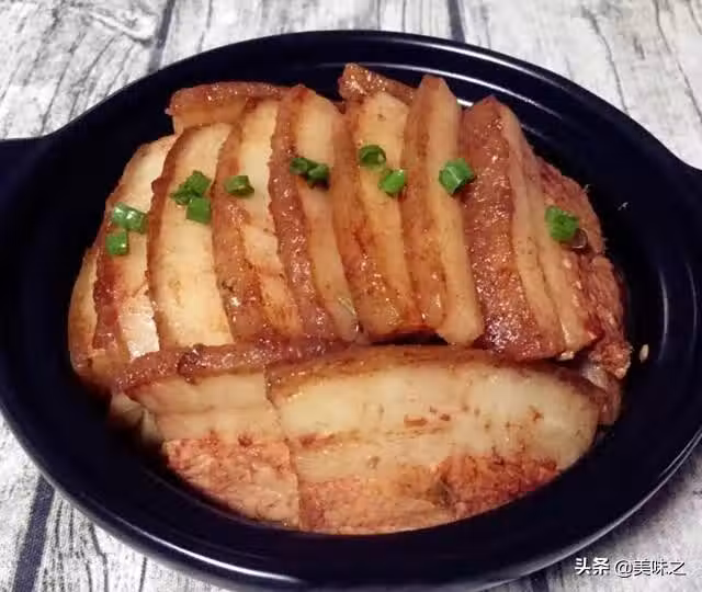 12、在深一點的盤子中將五花肉皮朝下鋪好,上面鋪上梅乾菜。