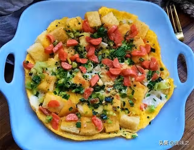 6、雞蛋液凝固後撒入西蘭花碎和火腿腸。
