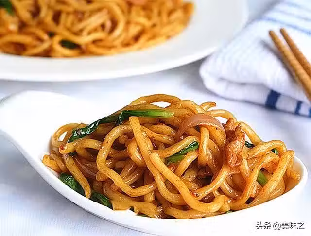 手擀麵200g、豬肉絲50g、小青菜適量、油適量、鹽適量、小洋蔥一個、大蒜一瓣、鮮醬油適量、老抽適量、辣椒麵適量、孜然粉適量、料酒適量、玉米澱粉適量、甜麵醬適量、糖適量。