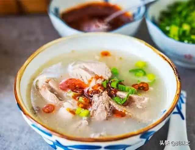 8、碗里放羊肉片,倒入煮沸的羊肉湯,撒上蒜苗,淋上油潑辣椒,調鹽入味後就可以美美的大快朵頤了。趁熱喝到鼻尖冒出汗珠兒,渾身通透順暢。