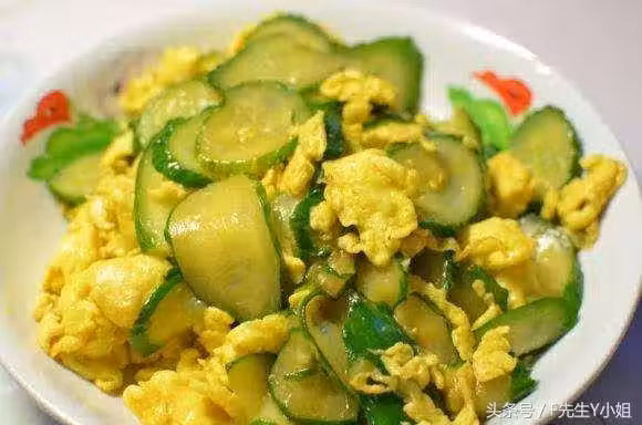 4、再在鍋里放適量的油,爆香蒜末,大火爆炒黃瓜片,放少許鹽炒軟,放雞蛋,蔥花炒勻,淋少許麻油裝盤。
