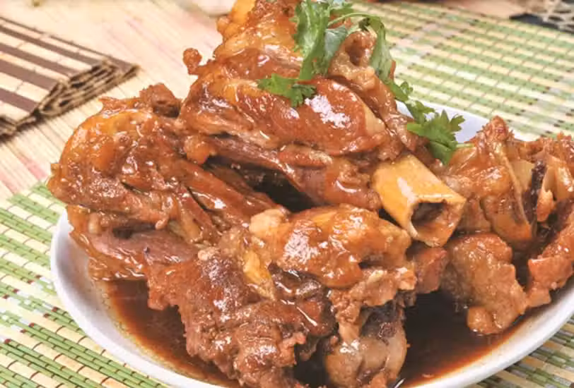當第二個菜上來的時候,我更加鬱悶了,雖然是好料:醬大骨,但是我也吃不了,只能聞聞味道,第三道菜是紅燒肉,非常大塊又油膩,對我而言無法入口,等第四道菜端上來的時候,我更是無言,是一盤蒸蟹腿,我連蟹黃都吃不到,這個要吃的只能用嘴硬咬,於是我也是只能看著,不能吃。