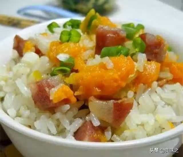 大米100g、南瓜70g、香肚100g、食油1勺、鹽適量、胡椒適量。