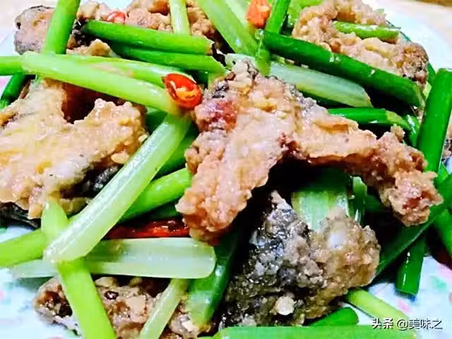 6、芹蒜翻炒均勻入味後,倒入烘好的炸魚翻炒均勻。