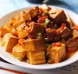 配料:豆腐1塊、青椒1個、紅椒1個、油適量、鹽適量、老抽適量、蚝油適量