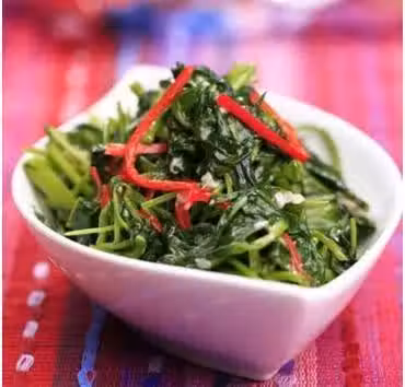 食材:空心菜500g,紅尖椒2個,腐乳3塊,腐乳汁少許,細砂糖1茶匙,細鹽1/2茶匙。